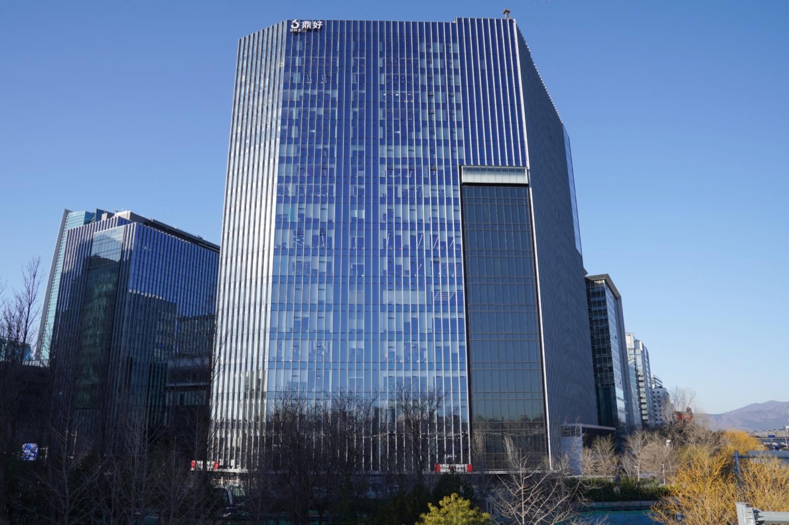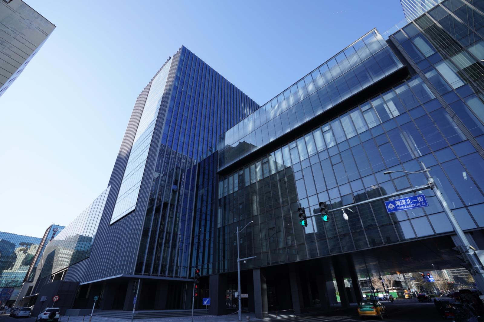 出了中关村地铁站,抬头就能看到崭新的中关村鼎好DH3。大厦外立面整体为蓝色、黑色玻璃幕墙,有垂直的金属装饰翼,显得简洁、挺拔,科技感十足,与周边区域楼宇相得益彰。